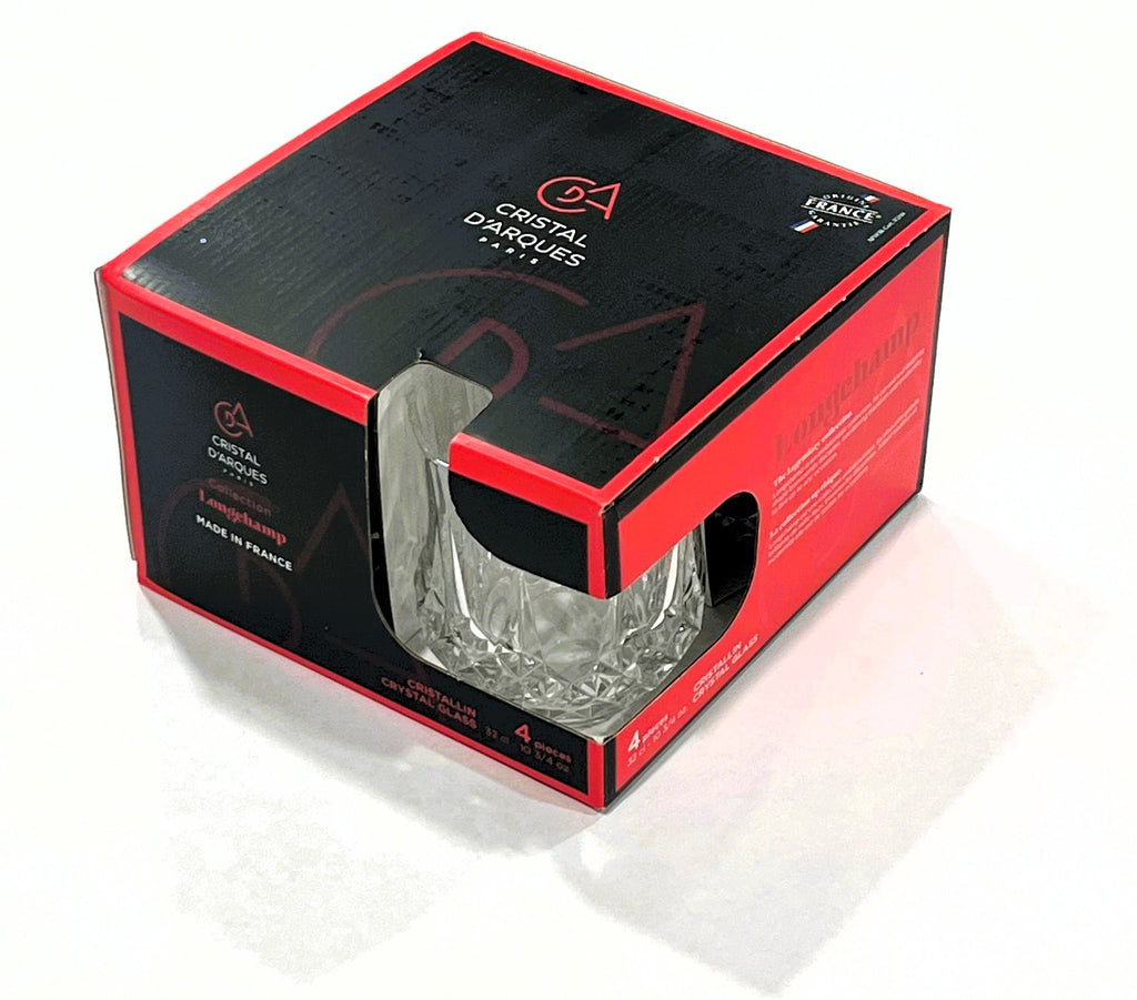 Savor your favorite drinks in style with this Longchamp Double Old Fashion glass set from Eclat France. The set includes four glasses, each with a capacity of 10.75-oz and a dimension of 3.2" Diameter X 3.7" Tall. These glasses are perfect for serving cocktails, whiskey, or any other beverage. Made in France, these glasses are a great addition to any home bar or as a gift for a loved one who enjoys entertaining. # V5117 L7765