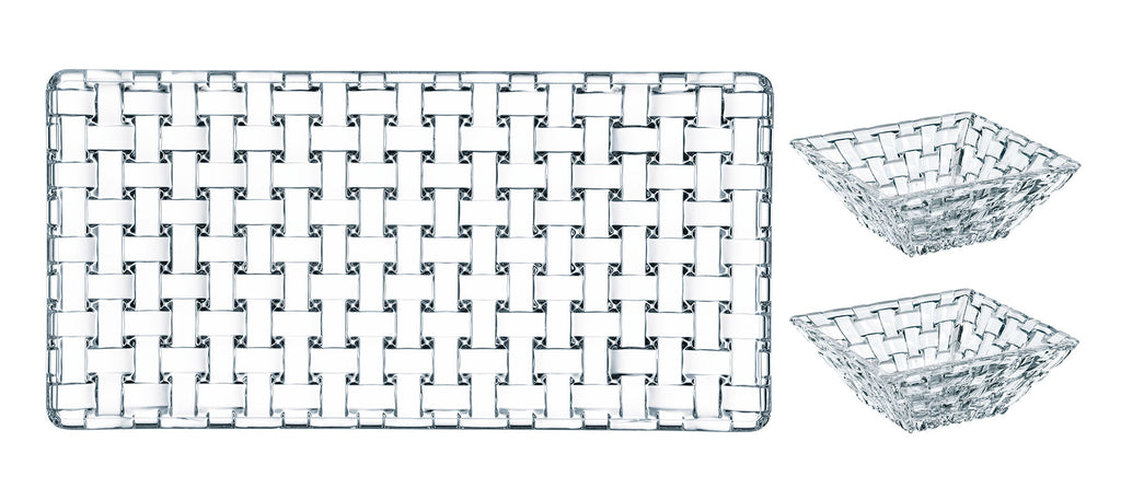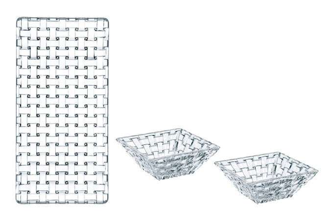 This platter and bowl set is made of top quality crystal. The tray is wide set at 11"WIDE X 5.5"DEEP, and the two crystal bowls fit perfectly on the tray. Dishwasher safe. Made in Germany. # 90026