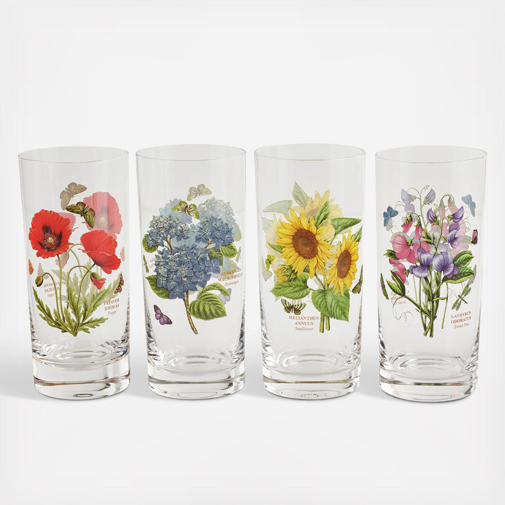 - FLORAL DESIGN: These Botanic Garden High Ball glasses come as a set of 4 with each glass featuring a different motif. They will add extra sparkle to any table display.